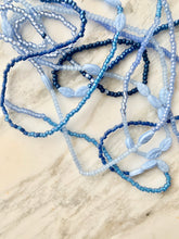 AQUAMARINE DREAMS Pale, ice-blue faceted aquamarine rondelles are the featured bead in this multi-textured necklace made up of cool blue hues. Vintage blue Japanese milk-glass leaves are dotted throughout (18 total). Eight different kinds of Japanese glass seed beads make a monochrome melody, including silver-lined matte pale-sapphire beads, opalescent denim-blue beads, Turkish blue metallic beads, deep navy lustered beads, translucent soft-blue beads (Czech) and matte transparent pale-sapphire beads.