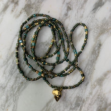 OLIVE SKULLY Matte-metallic beads in patinated shades of blue-green and olive give this 2-in-1 'wristlace' a little bit of edge, which is why the rustic-gold skull charm looks so right. Large rectangular turquoise-colored beads set off with gold beads serve as accents, along with some gorgeous rainbow-finished clear topaz cubes, verdigris brass metal spacers, and a smattering of fire-polished Czech glass accent beads. A piece of subdued shine and sparkle, there's a lot to look at and love!